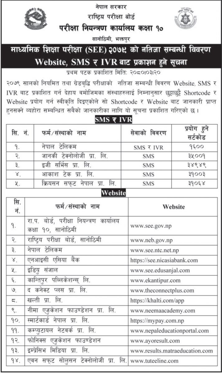 बुधबार एक सुचना जारी गर्दै बोर्डले एसइईको नतिजा हेर्न सक्ने विकल्पहरुकोबारेमा जानकारी गराएको छ । एसईईको नतिजा वेबसाइट, एसएमएस र आईभीआरबाट हेर्न सकिनेछ।
