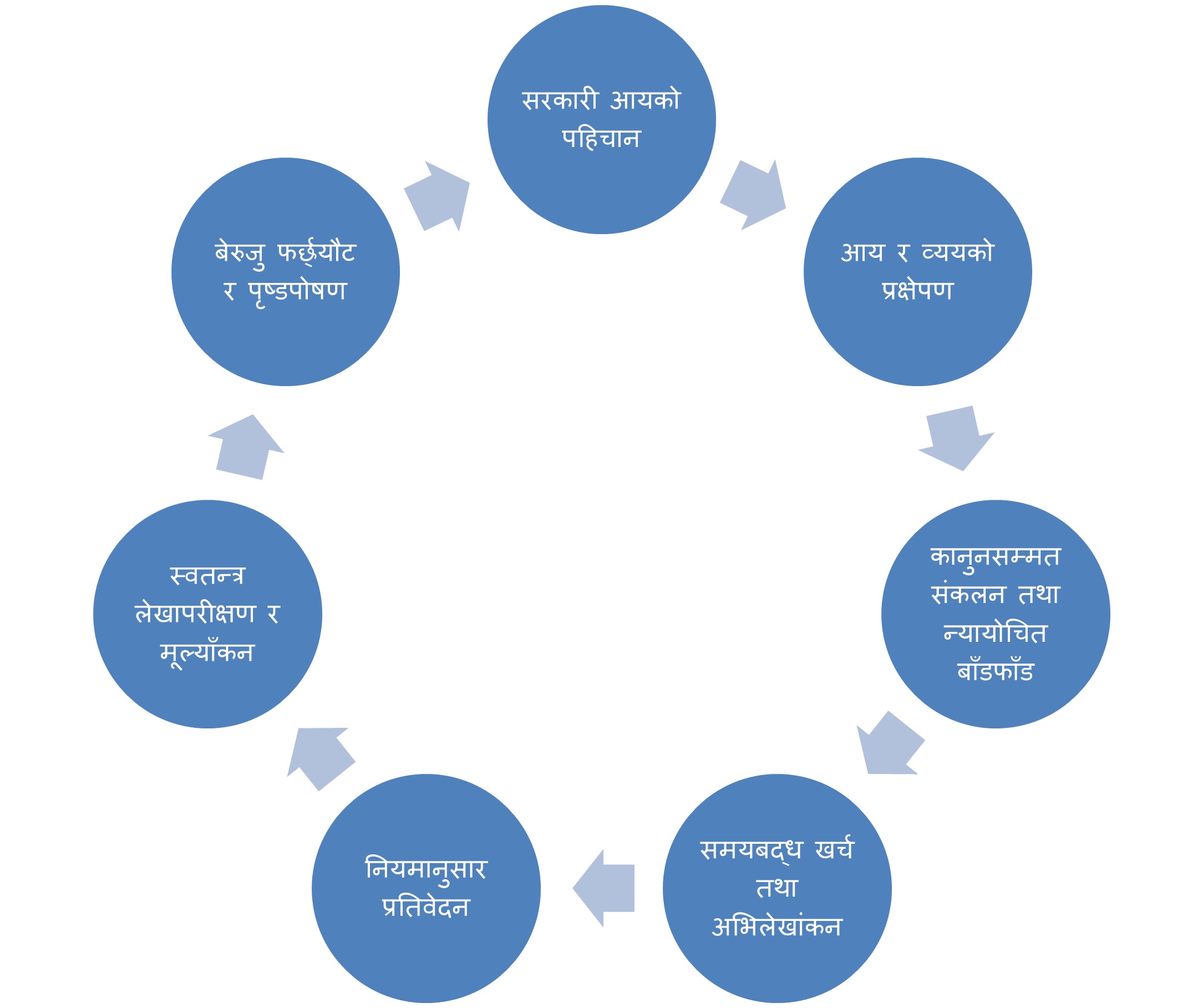 - कर तथा गैरकरको माध्ययमबाट सरकारी कोषमा रकम जम्मा गर्ने तथा वार्पिक आय र व्ययको प्रक्षेपणमार्फत बजेट को रुपमा आयव्ययको प्रक्षेपण गर्ने तथा विनियोजन ऐनको अधिनमा रही खर्च गर्ने तथा व्यवस्थित लेखा राख्ने सोको स्वतन्त्र तरीकाले लेखापरीक्षण गर्ने नियमित तालुक निकायमा प्रतिवेदन गर्ने तथा बेलैमा बेरुजु फर्छ्यौट गरी समग्र वित्तीय सुशासन कायम गर्ने कुरा सरकारी आर्थिक कार्य प्रणालीमा समेटीन्छन्।